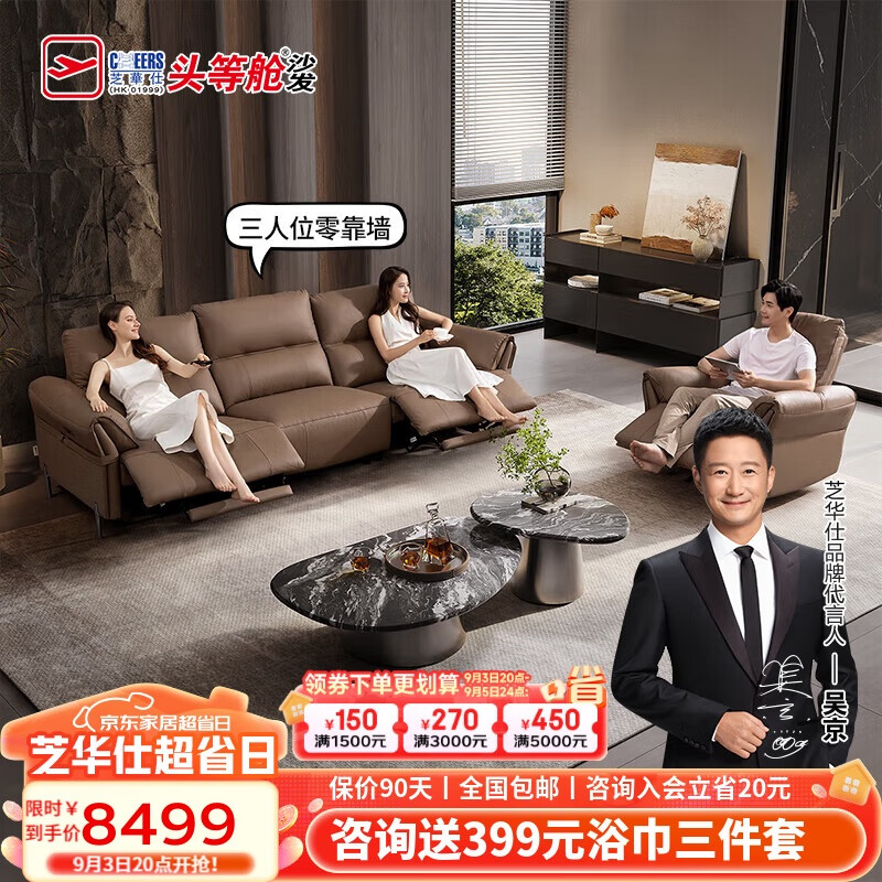 芝华仕(CHEERS)头等舱零靠墙意式真皮功能沙发大户型直排客厅芝华士50795棕3+1价格:8499.00元!