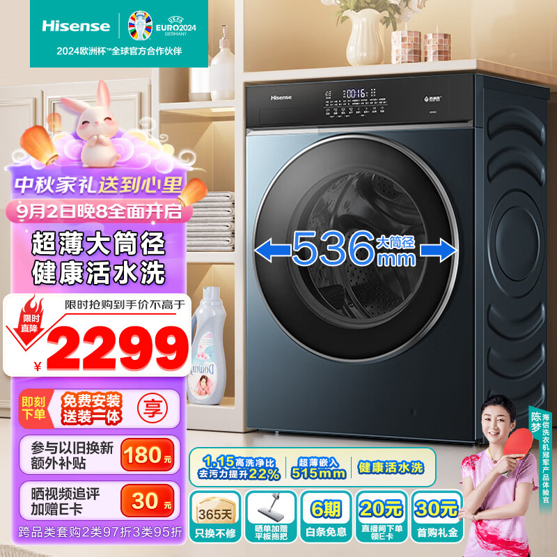 海信洗烘一体机滚筒洗衣机全自动 10公斤大筒径超薄平嵌 1.15高洗净比活水洗2.0 智能投 钢琴师HD10IE2价格:2299.00元!